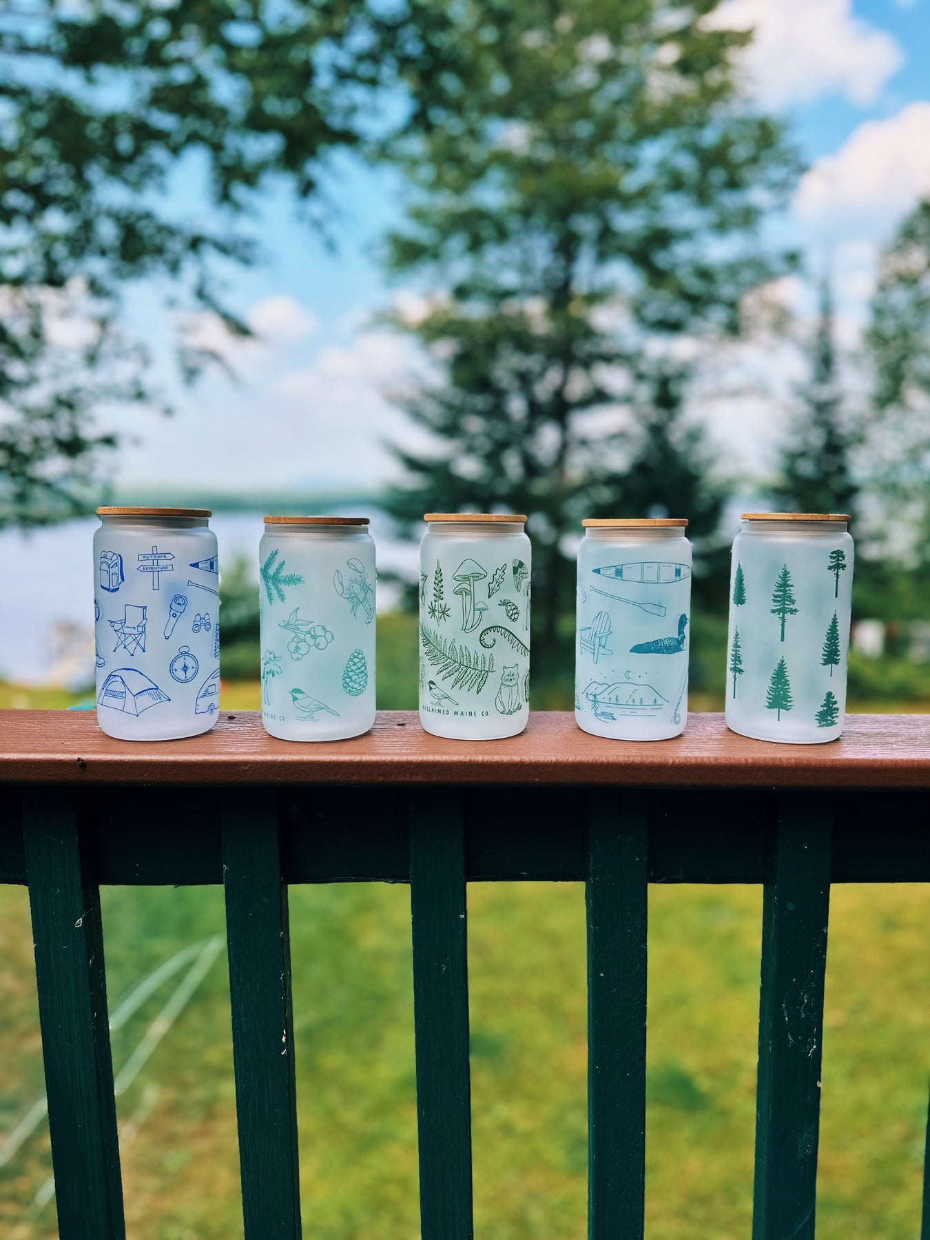 These 16oz. durable can glasses are the perfect high quality glass for any occasion. Their modern shape make them perfect for your daily coffee, water, or cocktail. Inspired by the Maine outdoors, this glass features a canoe, tent, camping gear, and a mountain lake scene.