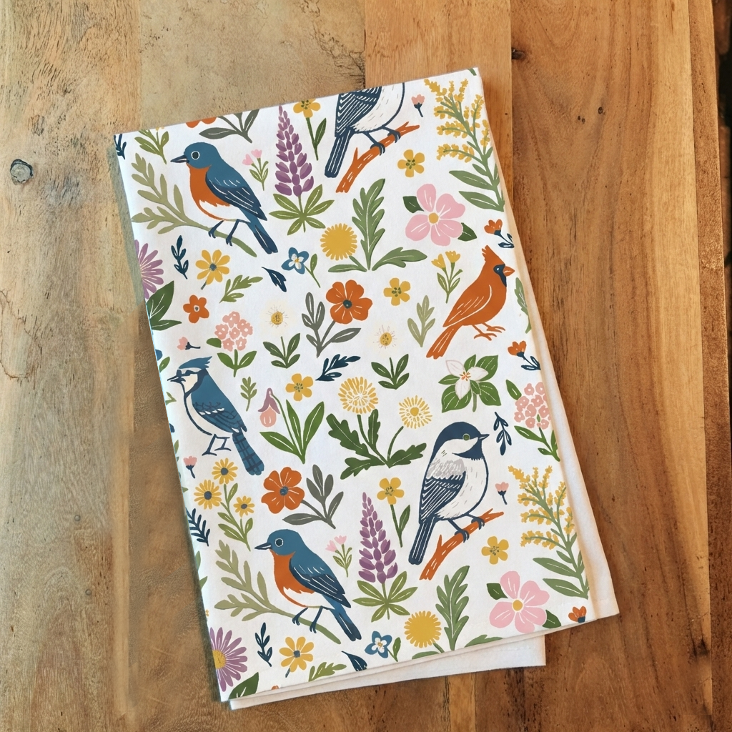 Bring a little garden charm into the heart of your home with our Backyard Birds Tea Towel. Featuring a lively pattern of hand-drawn songbirds nestled among blooming wildflowers and leafy branches, this towel celebrates the simple beauty of everyday moments—morning coffee, open windows, and birdsong outside.